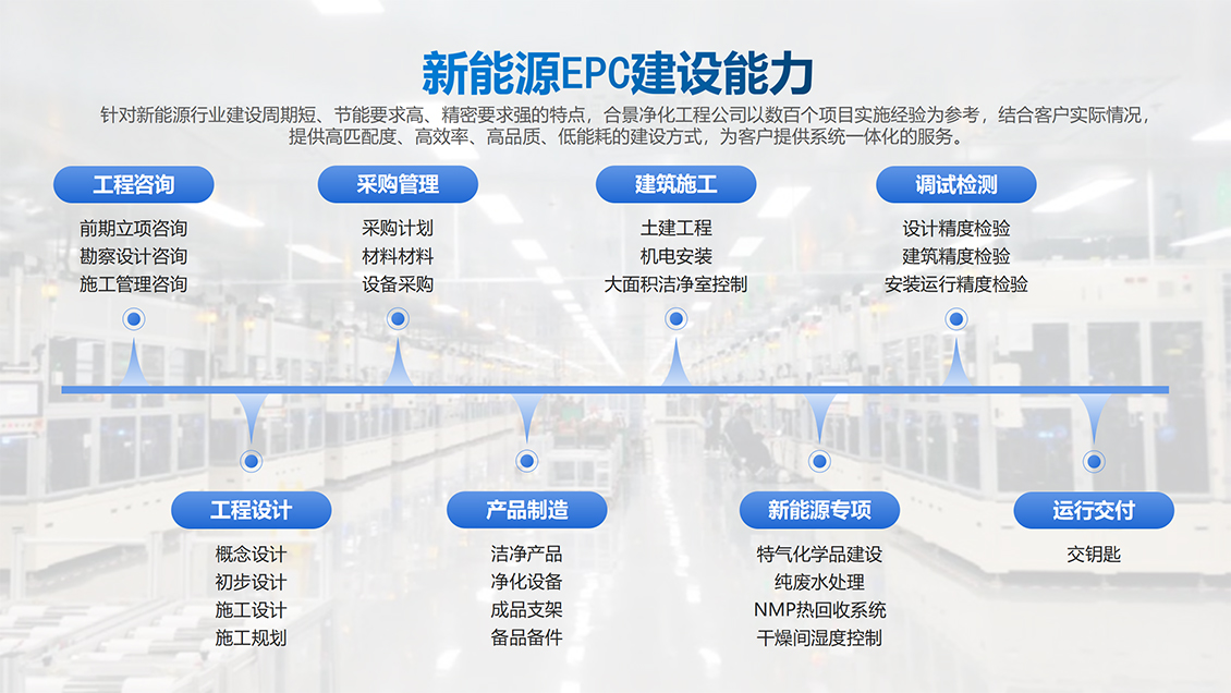 合景智慧建設是工業高端制造領域生產車間建設高潔凈度和低露點凈化車間內裝工程的規劃、設計、采購、施工與服務一體化總承包商,多年來,在大型廠房建設方面積累了大量豐富的低凈化車間內裝工程設計和施工經驗,特別是在產能規劃、公用工程、環境工程(溫度、低露點、高潔凈度)等領域的制造、工藝流程、節能環保等提供完善的系統集成工程建設解決方案。